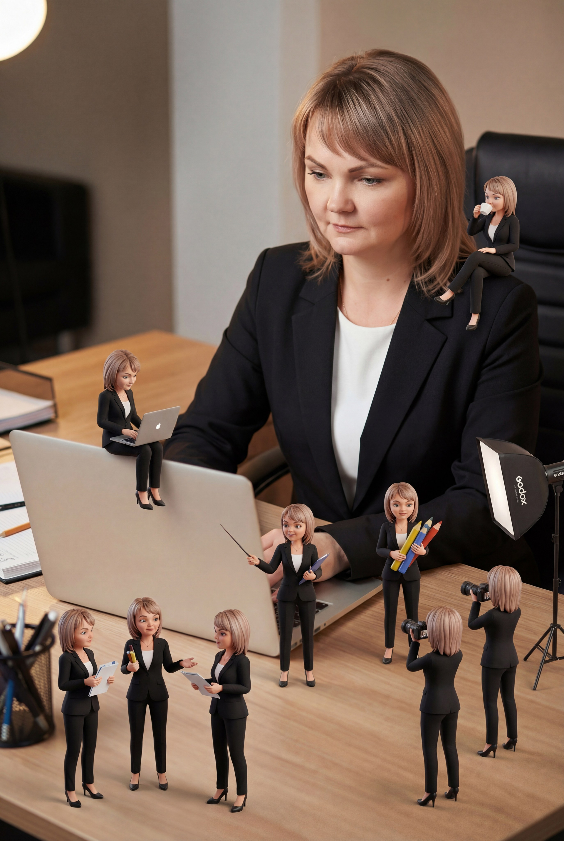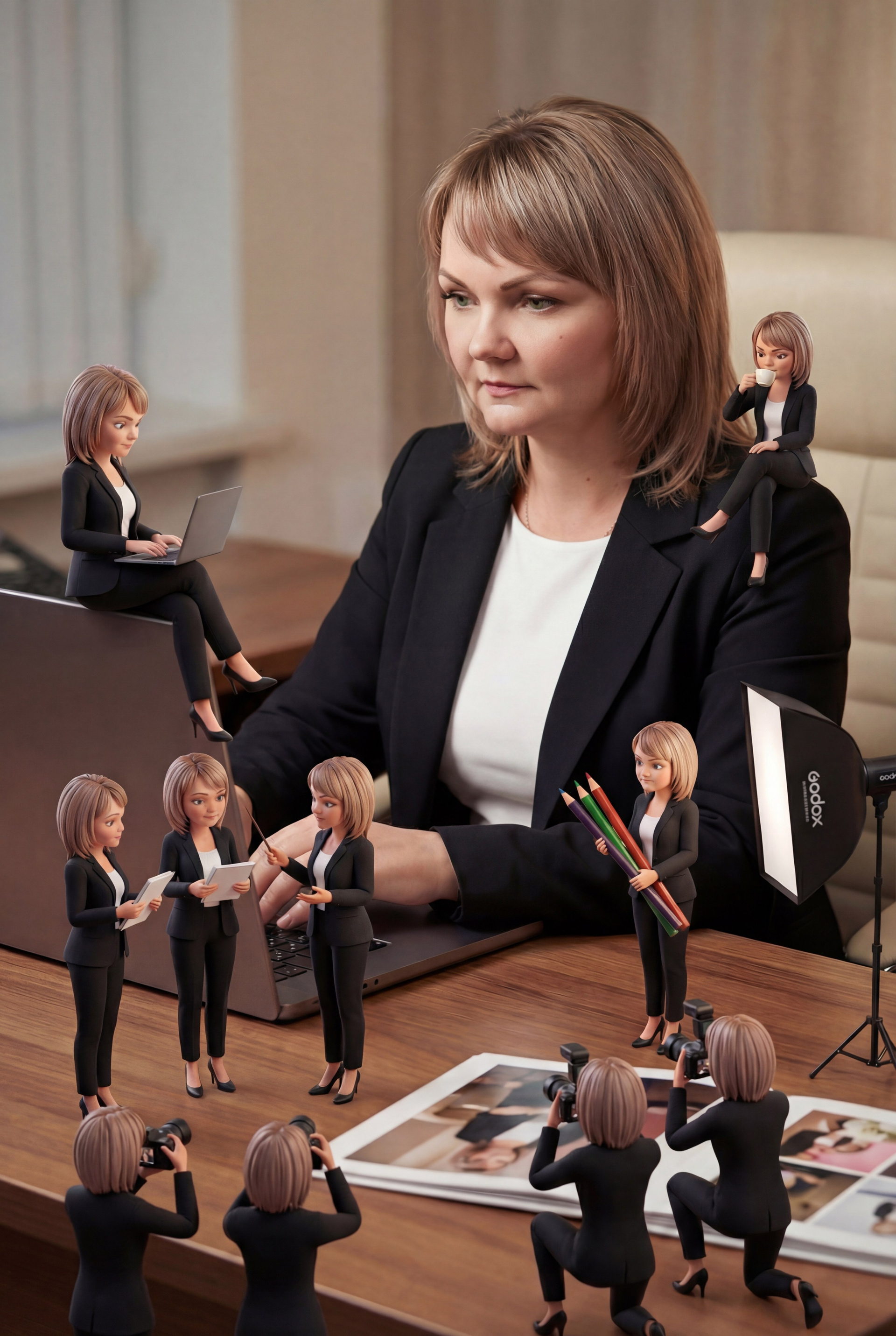 Мастеру Макияжа можно разместить фигурки таким образом, как будто они все вместе наводят красоту клиенту.