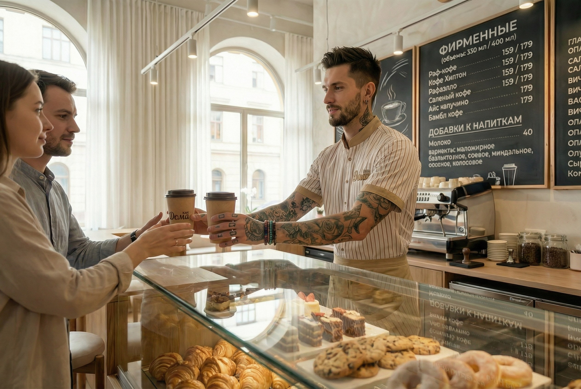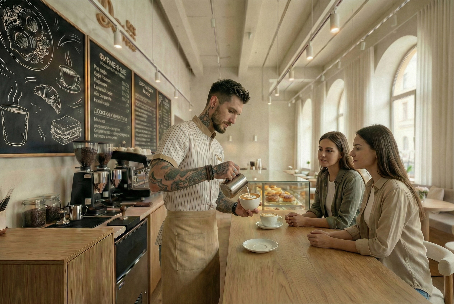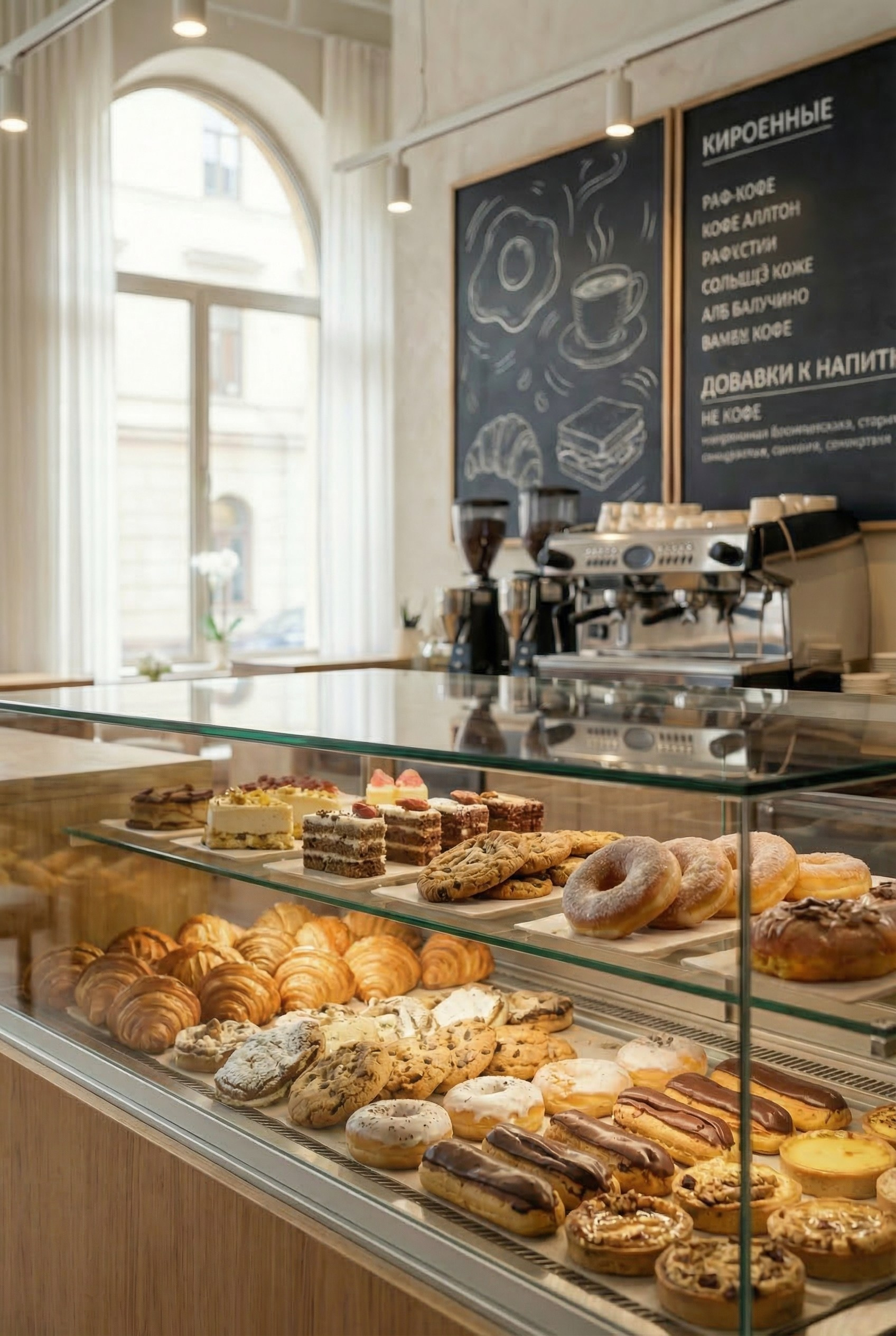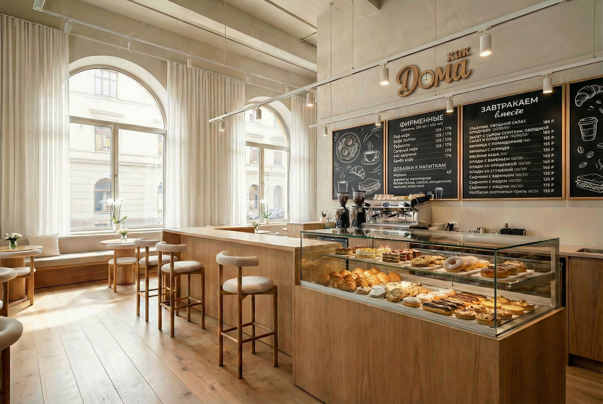 Отдельное внимание уделено деталям, формирующим доверие к проекту: выпечке, десертам, завтракам, кофейной подаче, витрине и сервировке. Эти элементы делают концепцию живой, реалистичной и коммерчески убедительной.