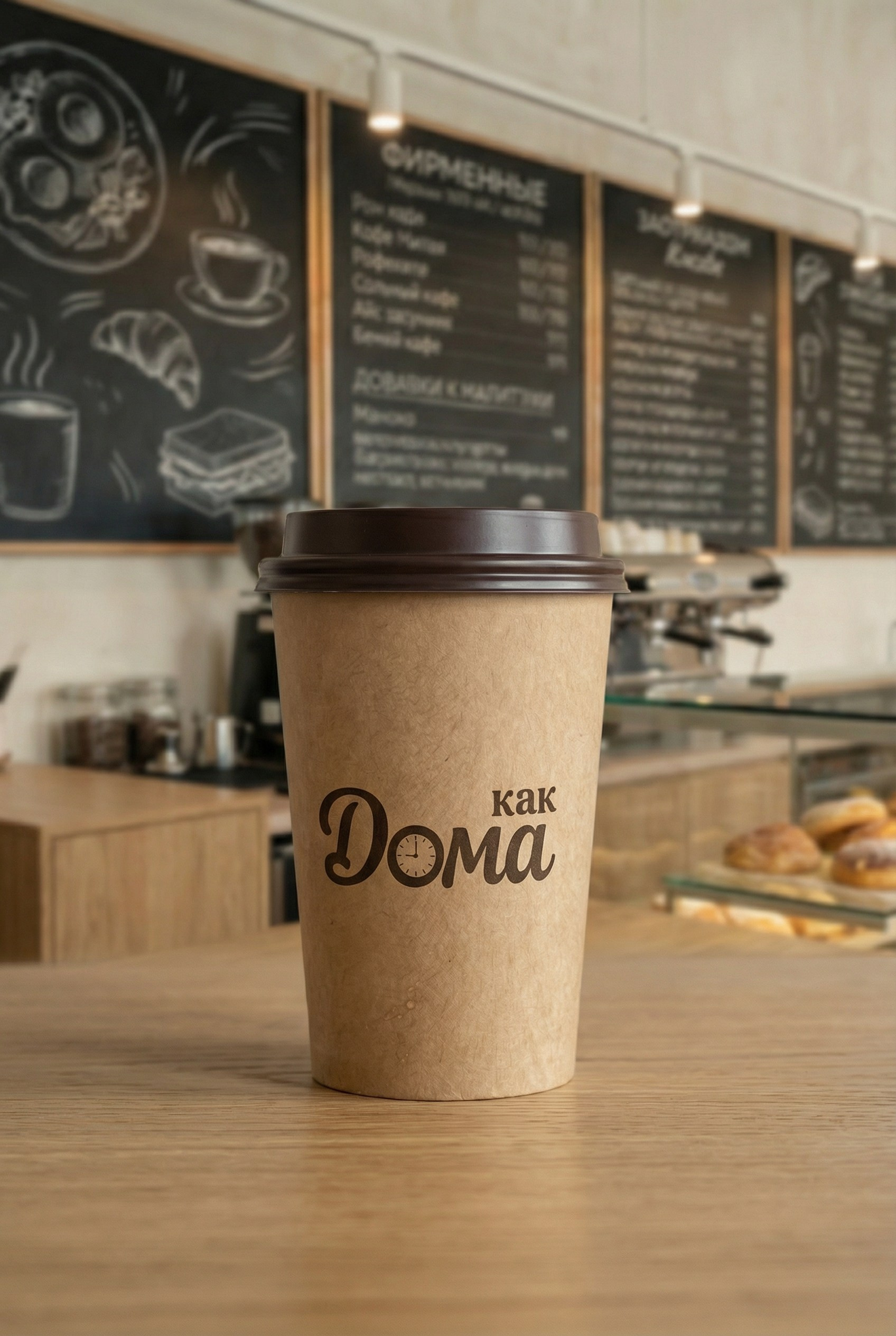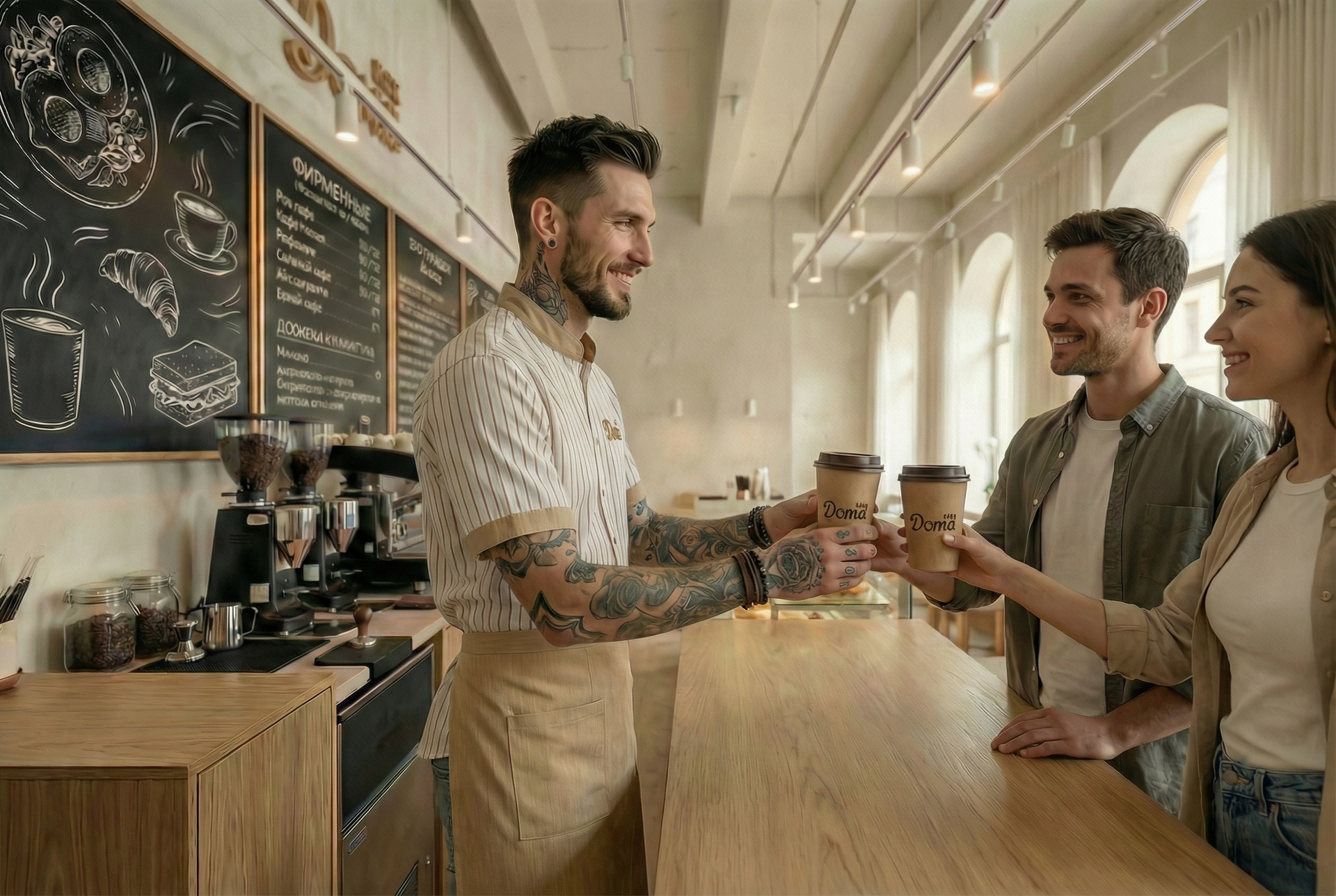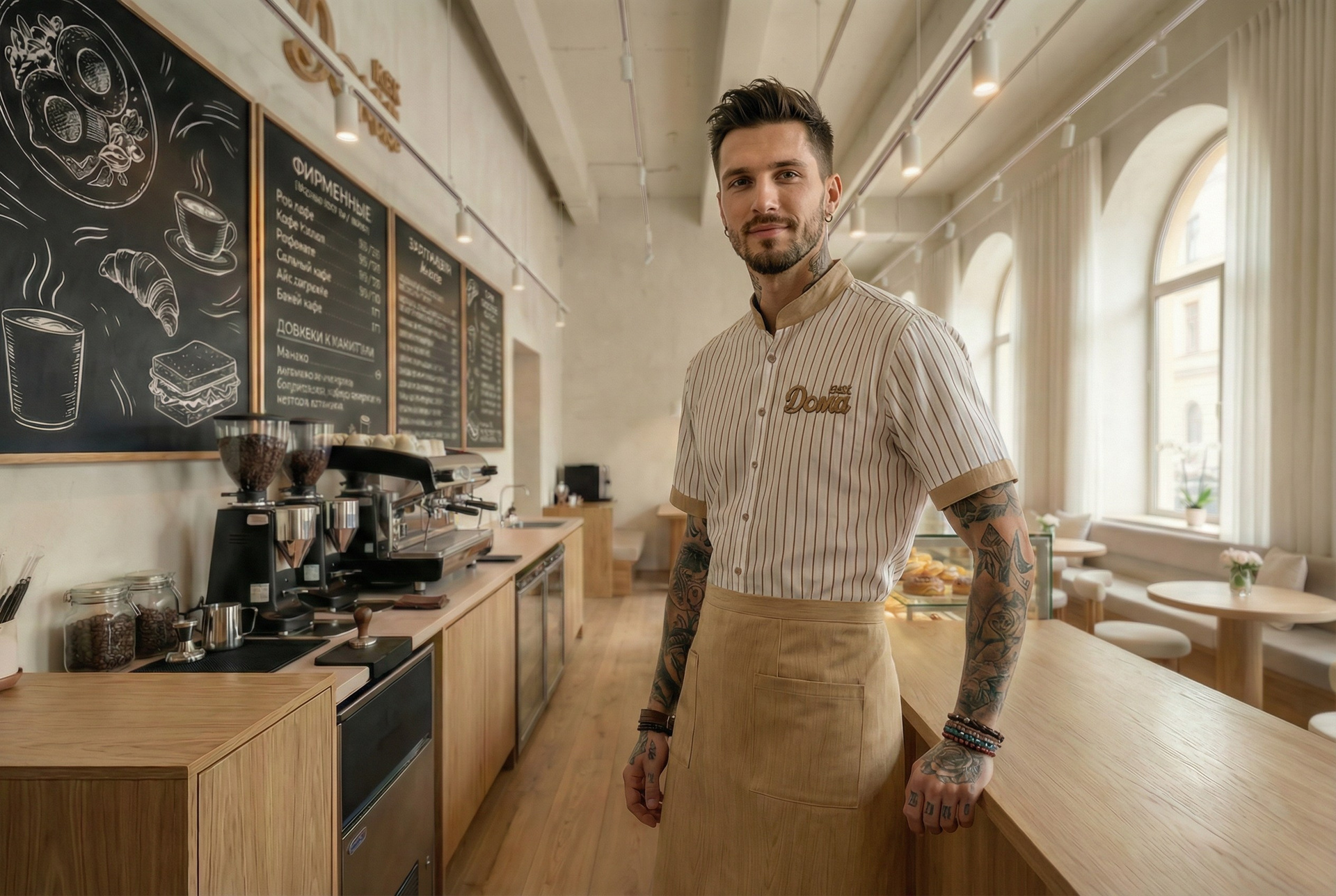 В проект интегрированы логотип, вывеска, меню, брендированные элементы и форма сотрудников. Все детали работают как единая визуальная система и усиливают образ заведения.