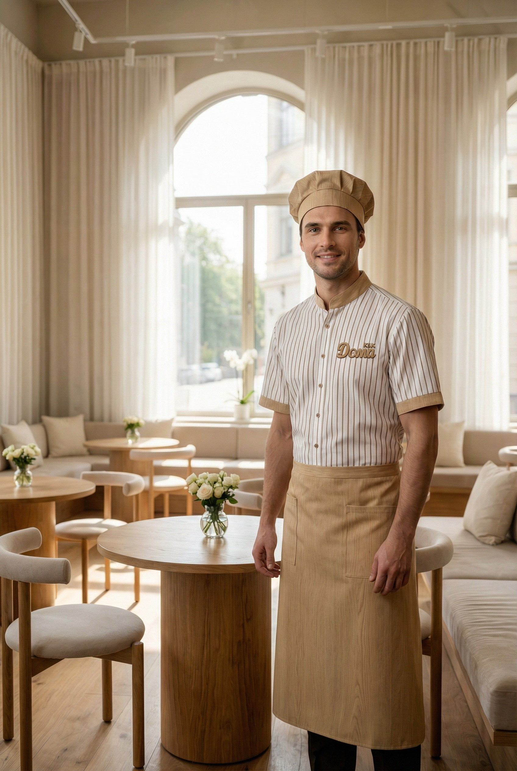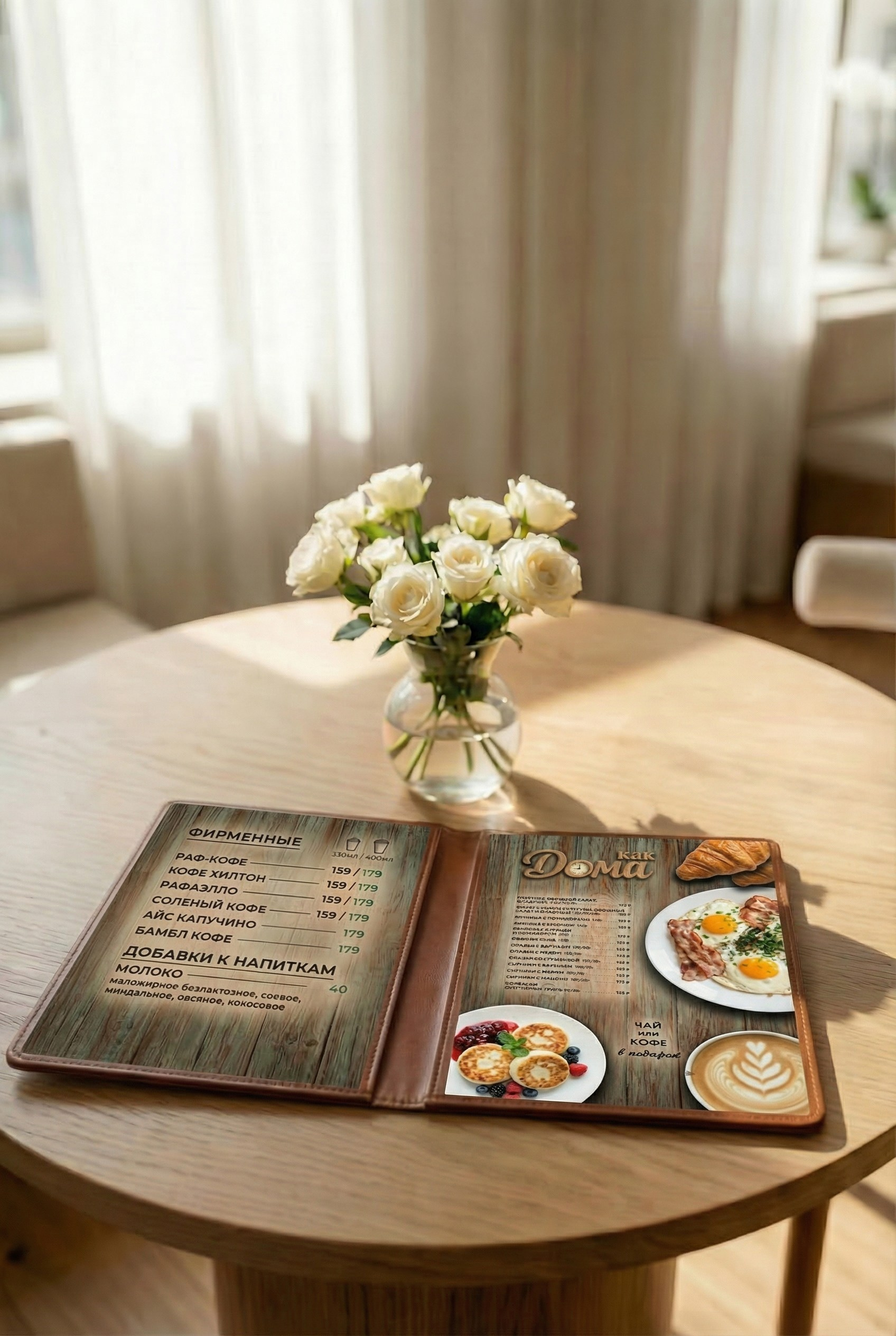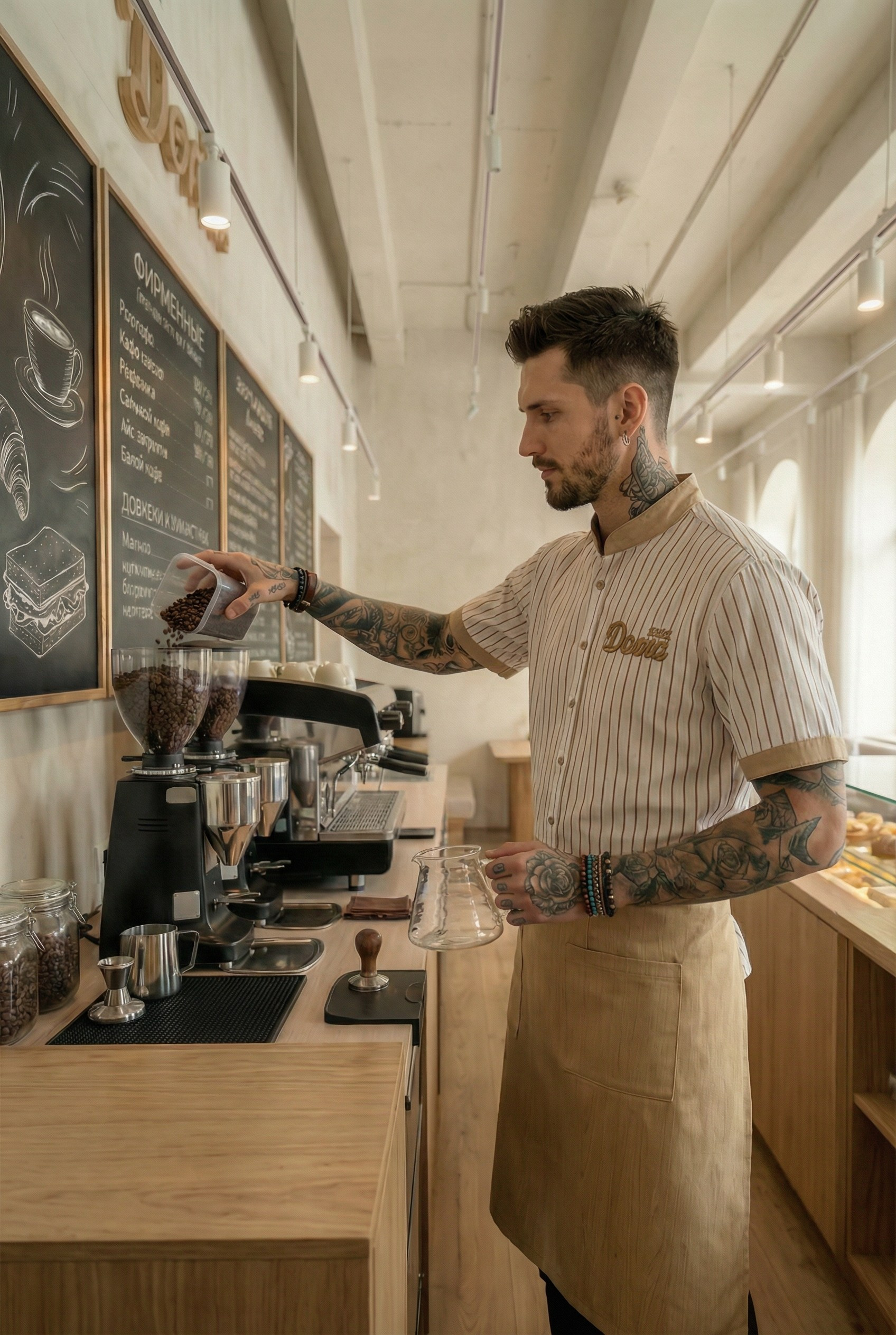 В проект интегрированы логотип, вывеска, меню, брендированные элементы и форма сотрудников. Все детали работают как единая визуальная система и усиливают образ заведения.