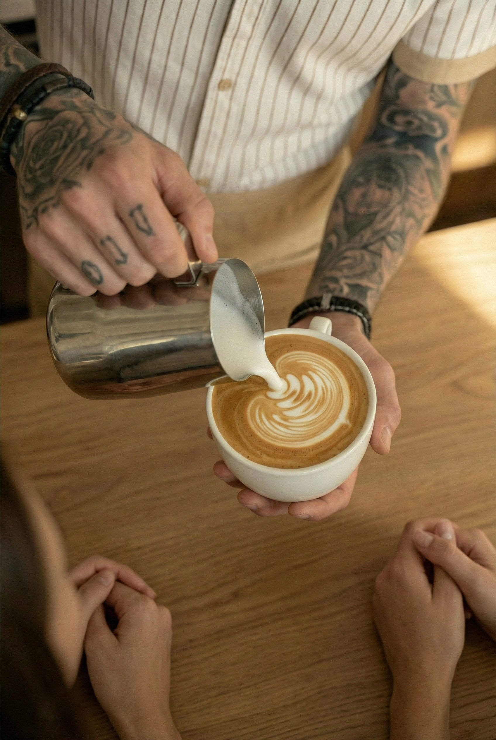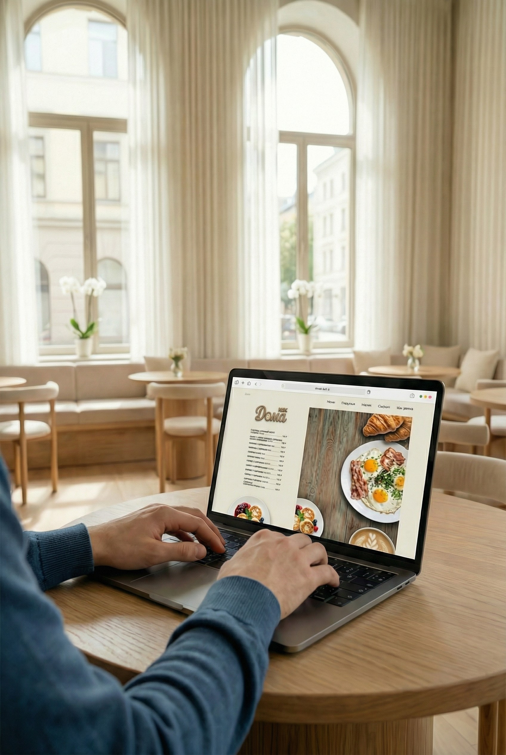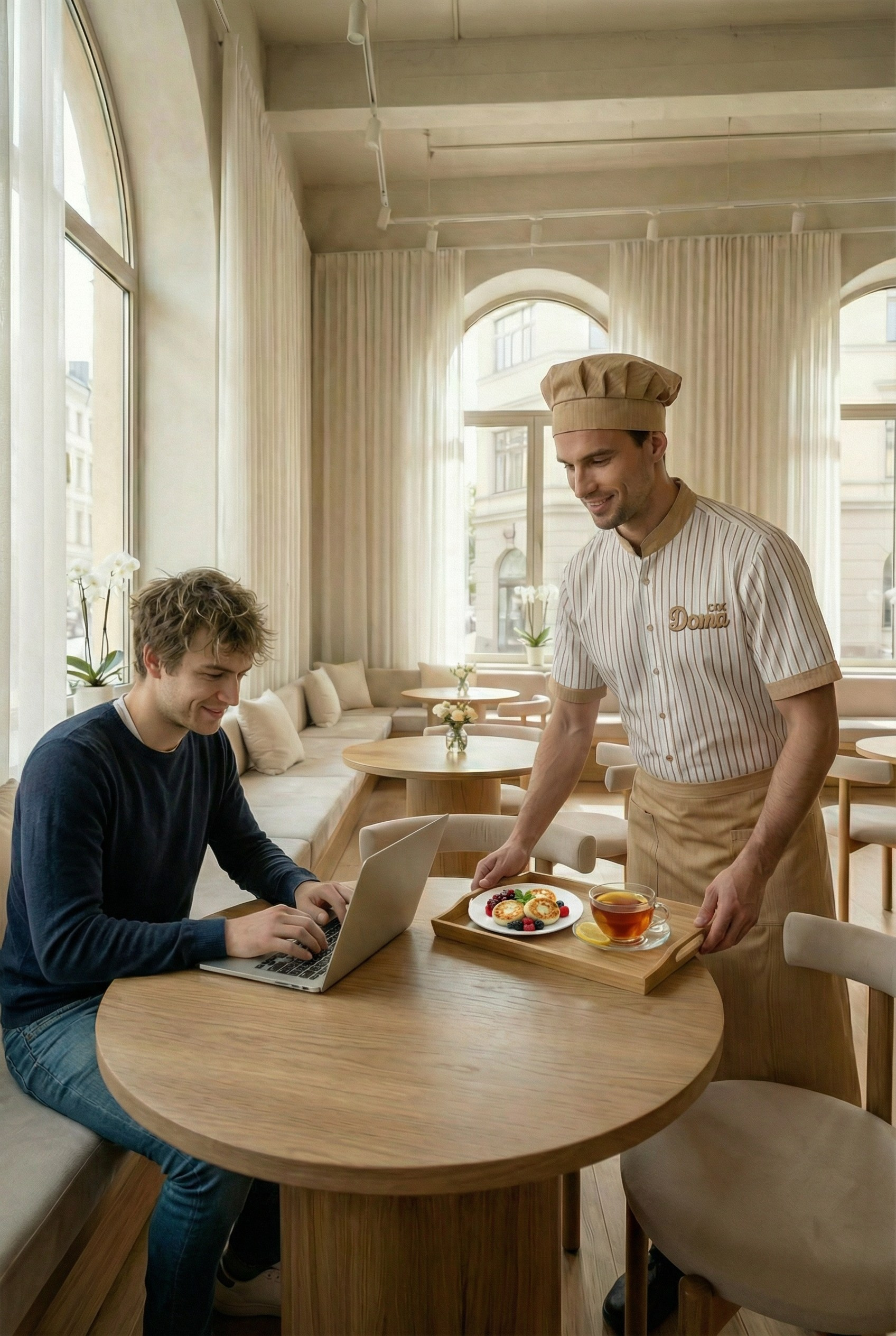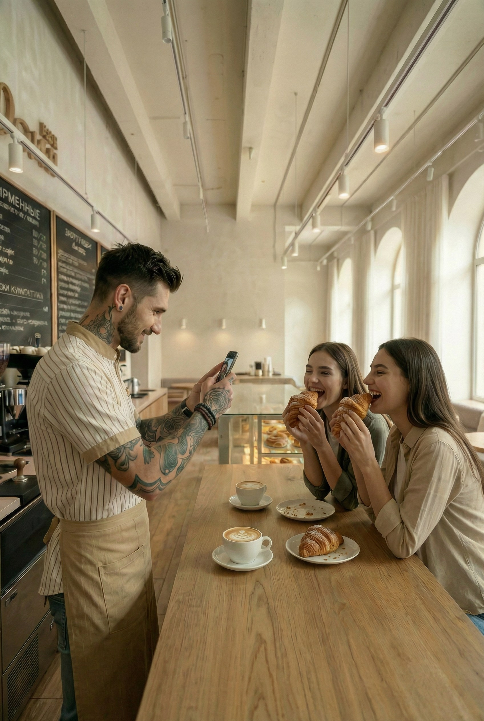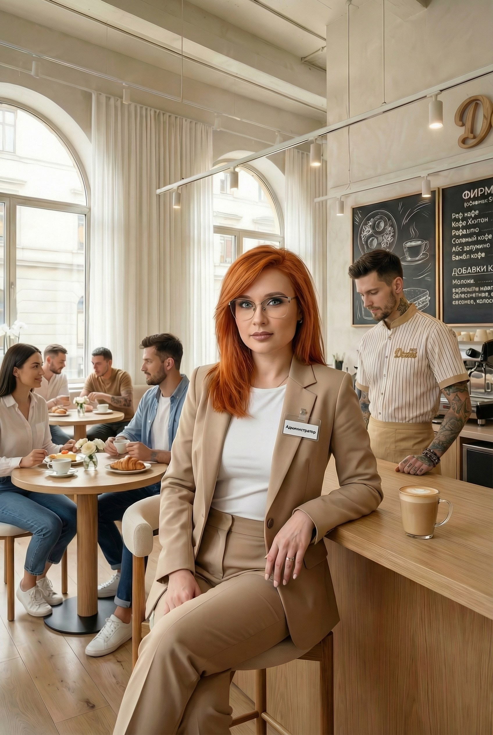 В итоге заказчик получил не набор отдельных изображений, а цельную визуальную концепцию кафе, где каждая деталь работает на общую идею бренда — от фасада до подачи блюд и формы персонала.