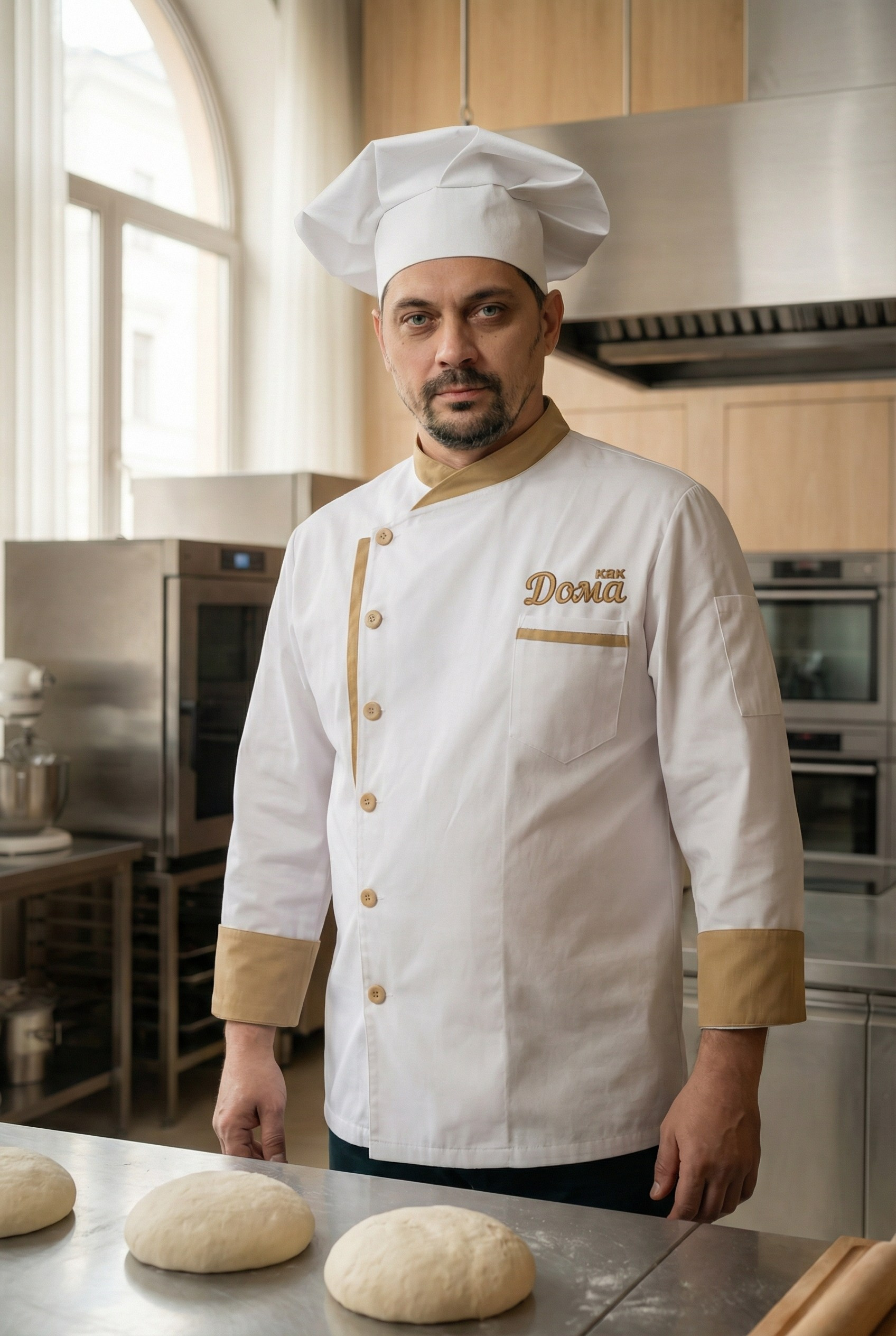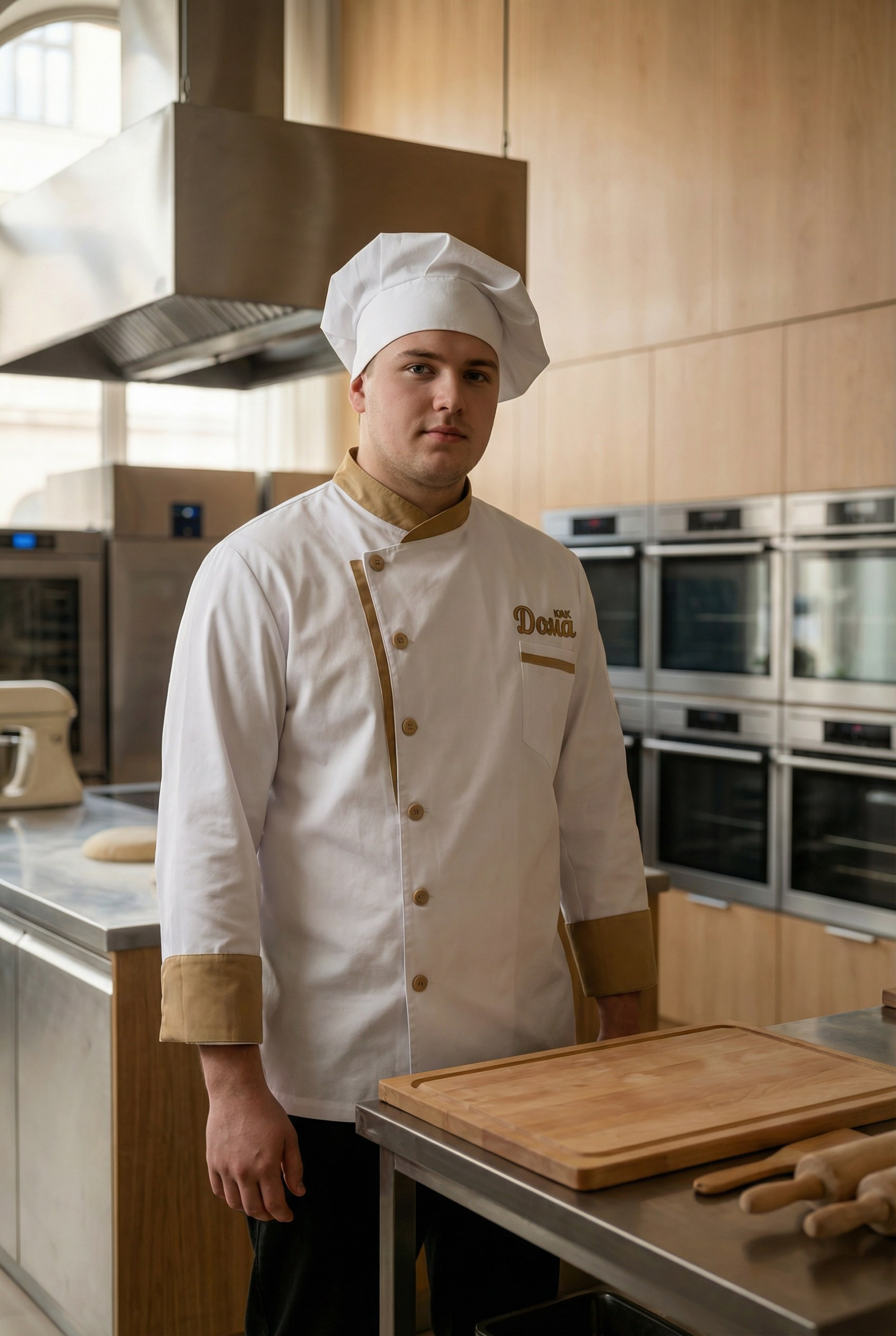 Кухонное пространство также визуализировано как часть общего бренда: форма поваров, рабочие поверхности, процессы приготовления и подача блюд поддерживают единую стилистику проекта.