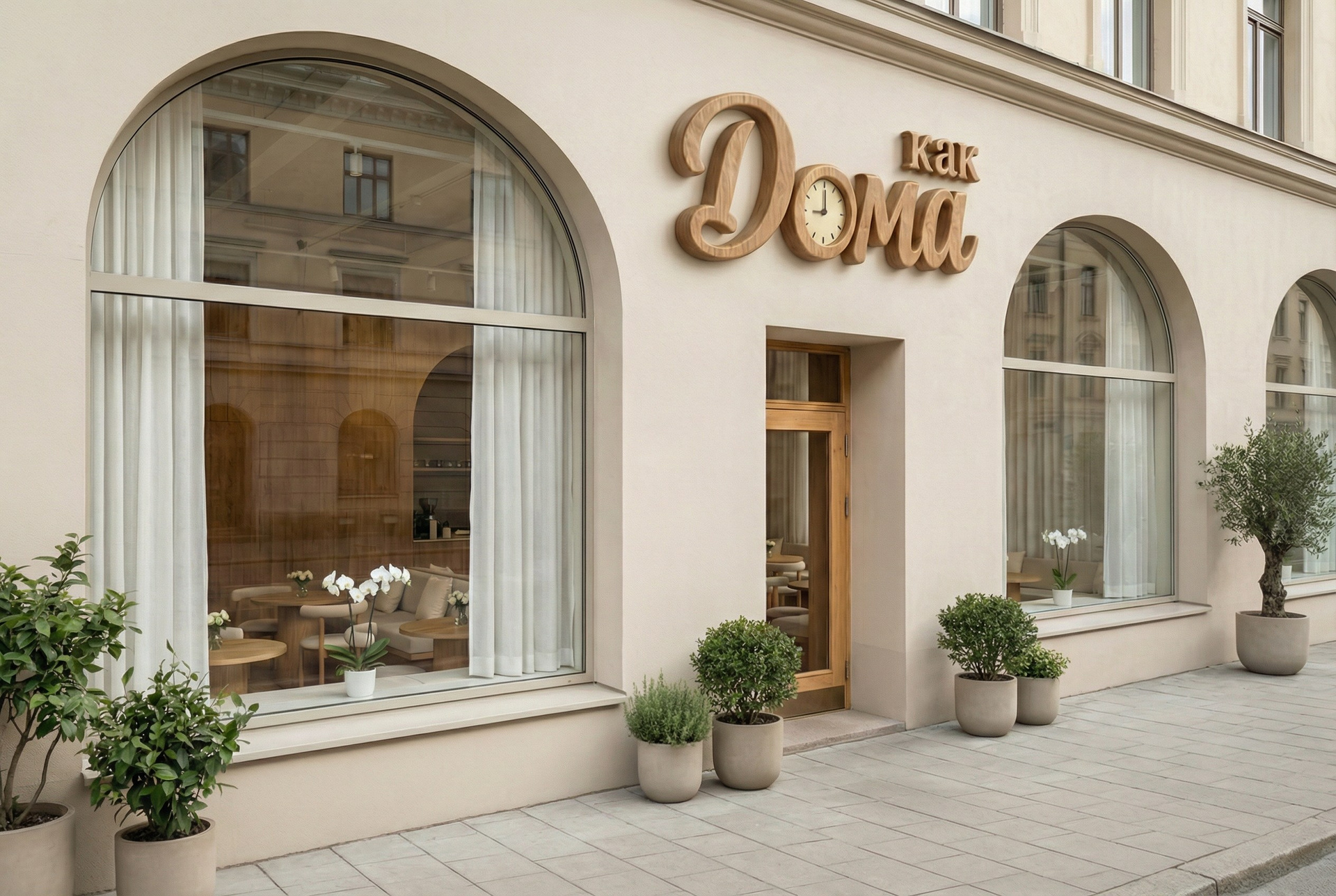 Создан узнаваемый фасад кафе с тёплой эстетикой, натуральной палитрой и визуально привлекательным образом, который сразу передаёт идею уюта и гостеприимства.
