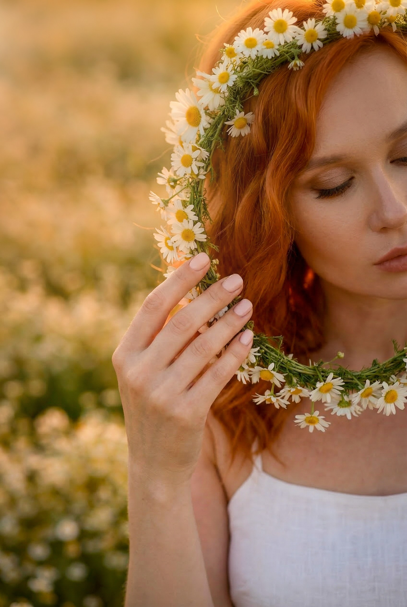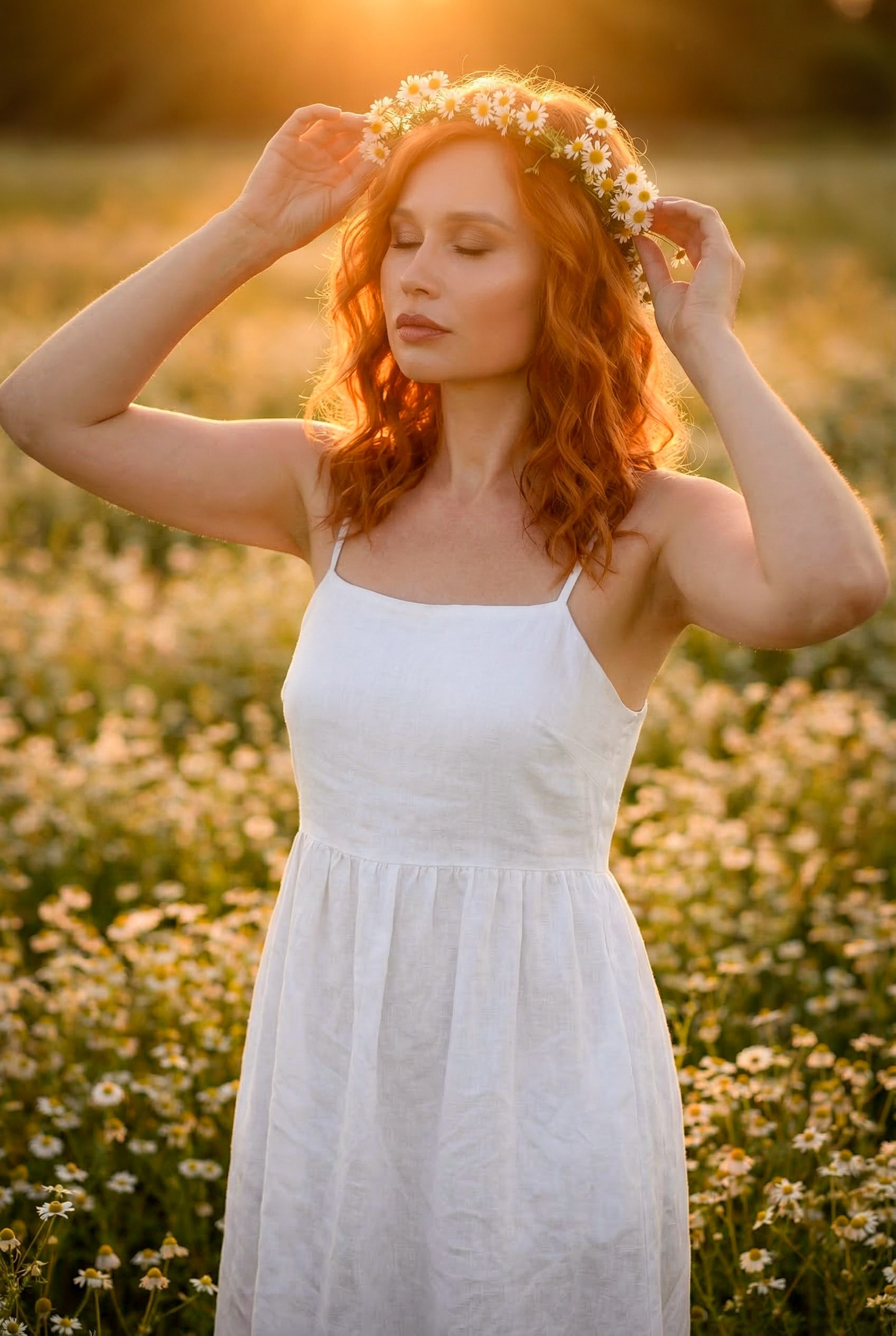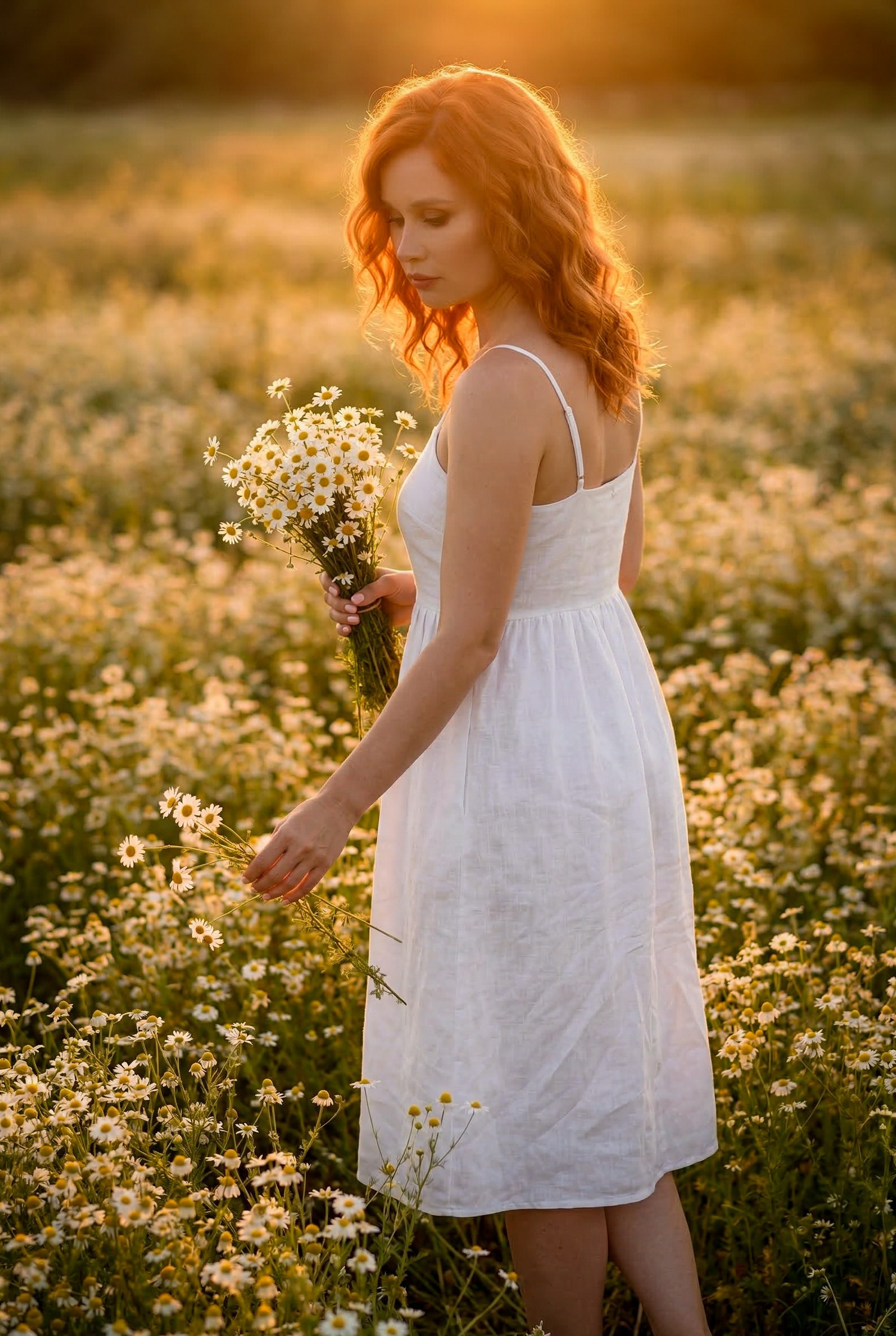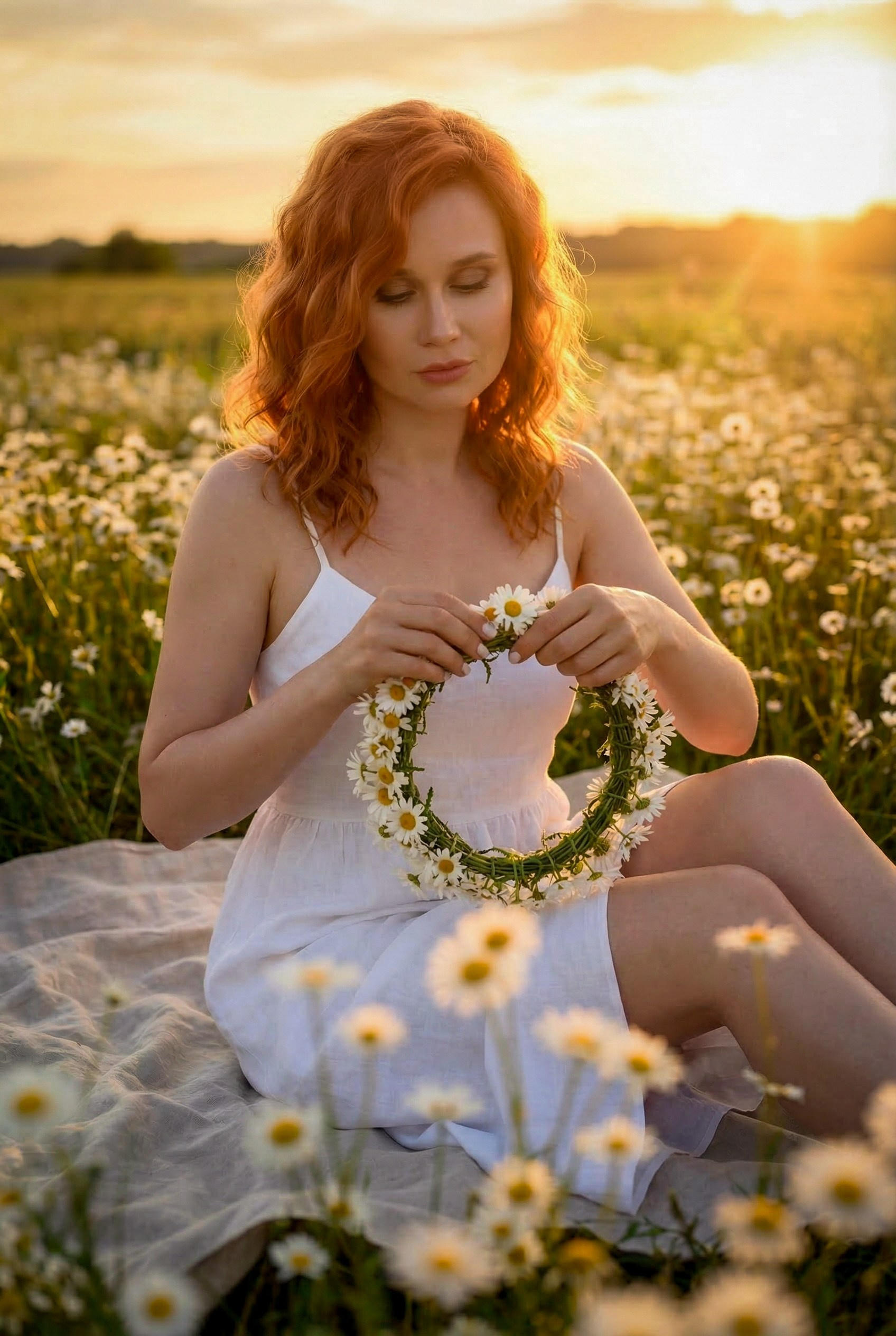 Очень красивая, нежная, летняя фотосессия на закате в ромашковом поле