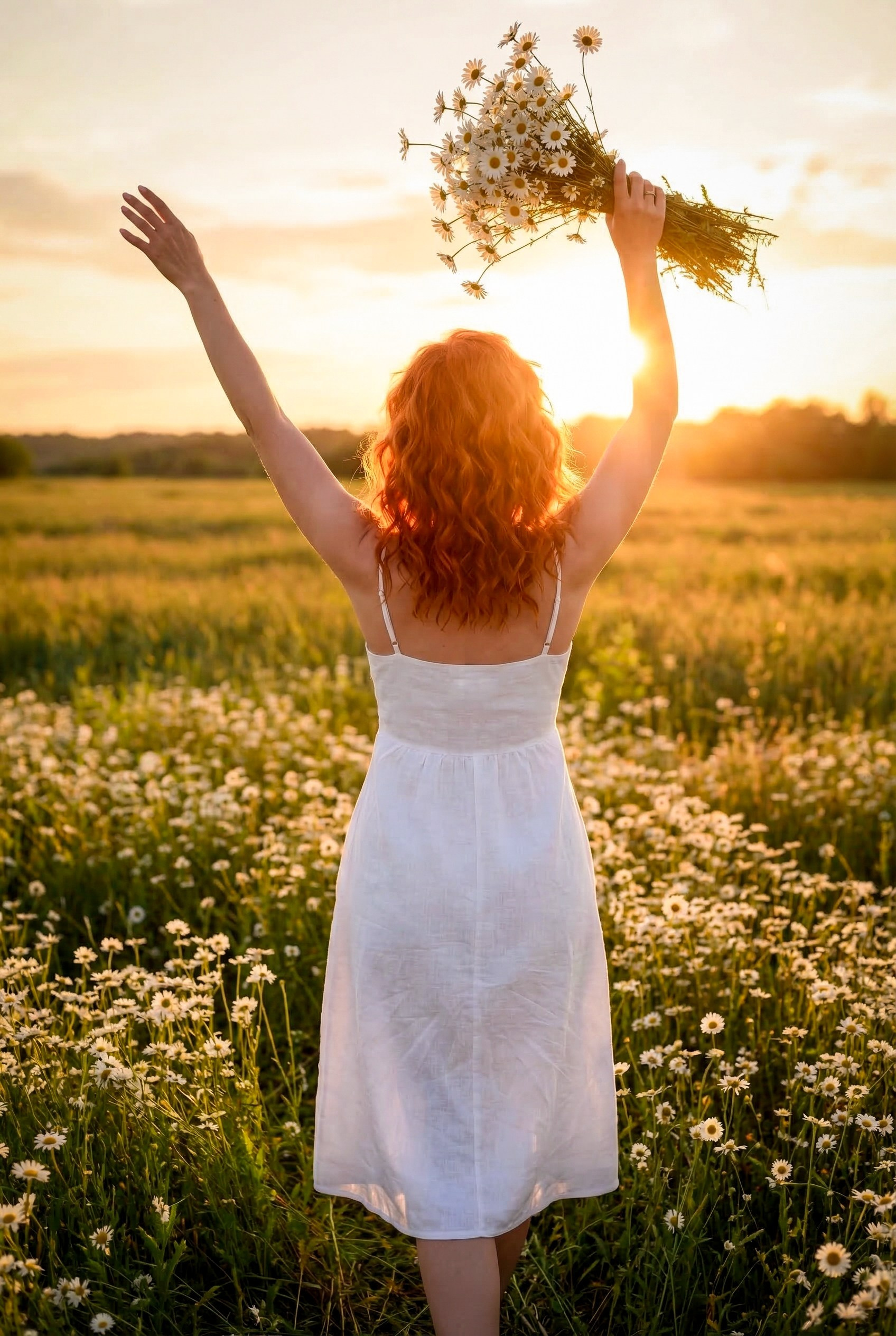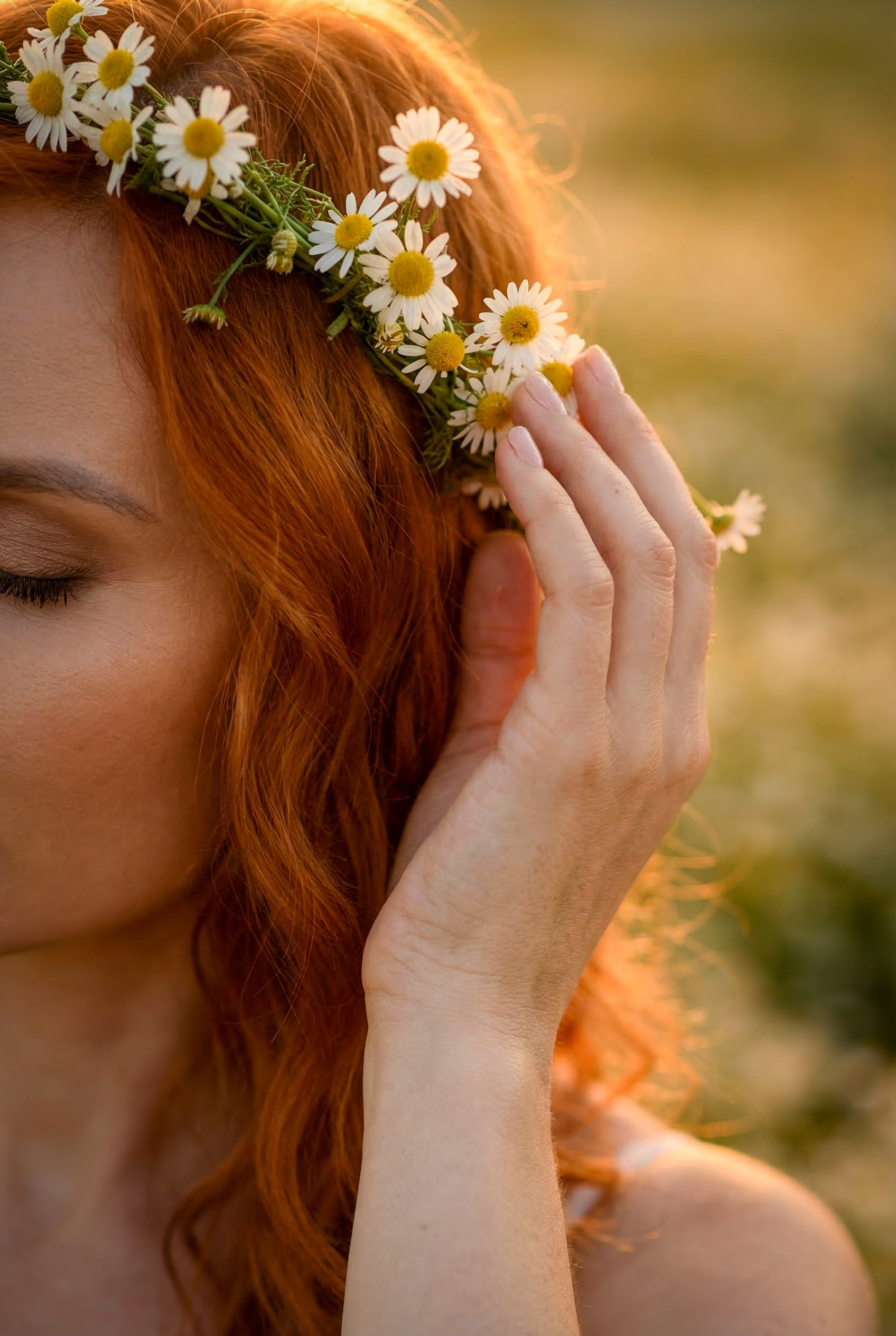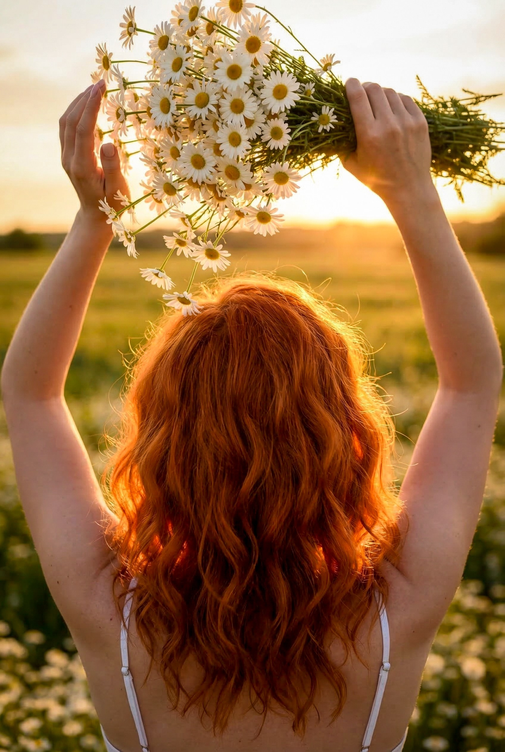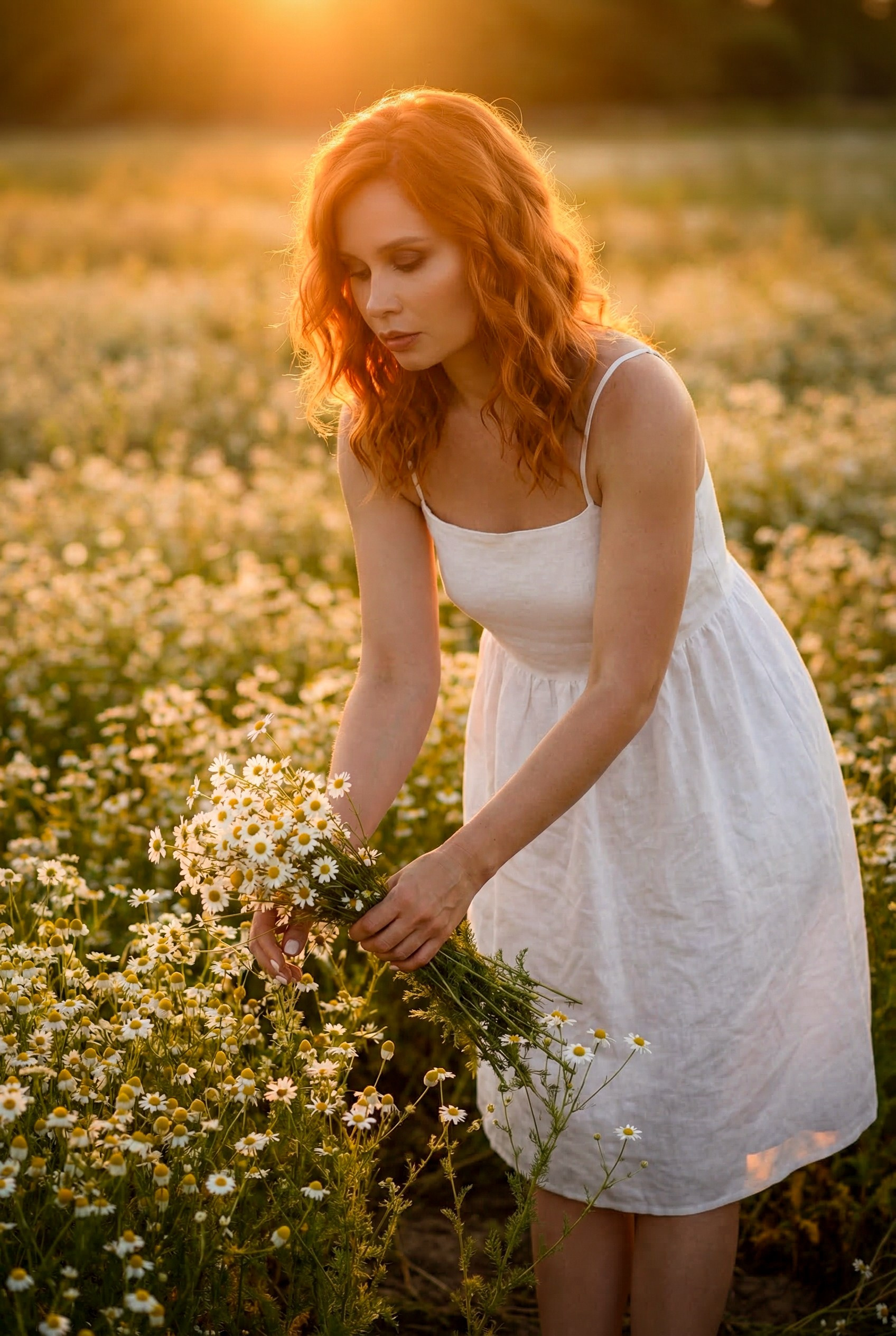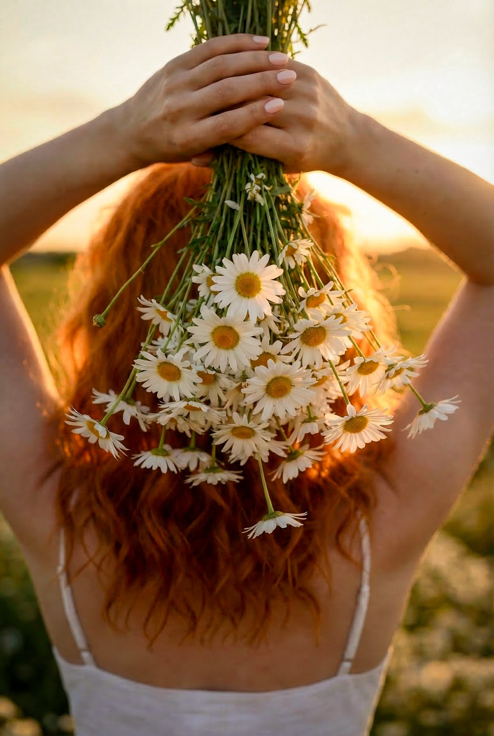 Очень красивая, нежная, летняя фотосессия на закате в ромашковом поле
